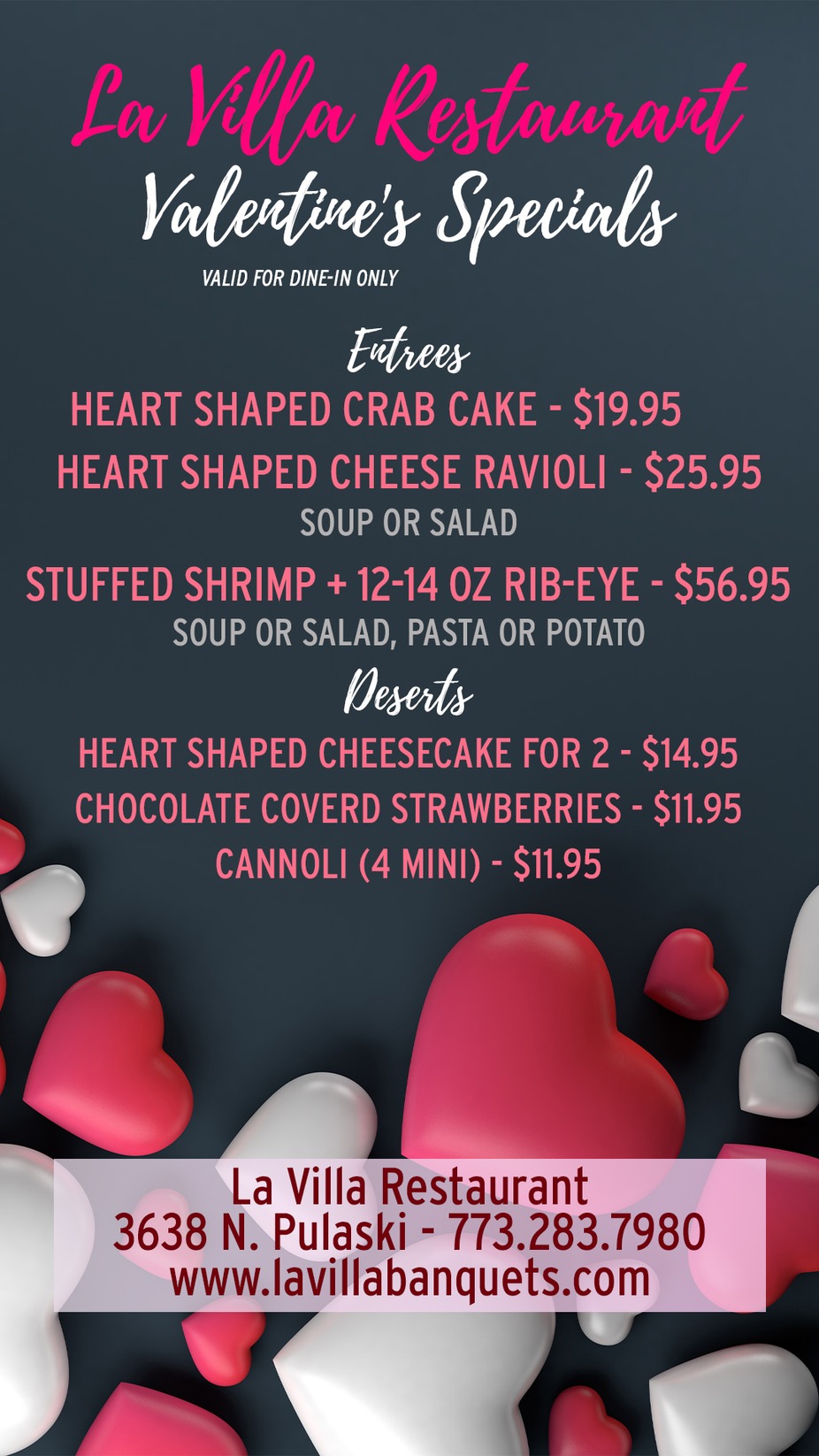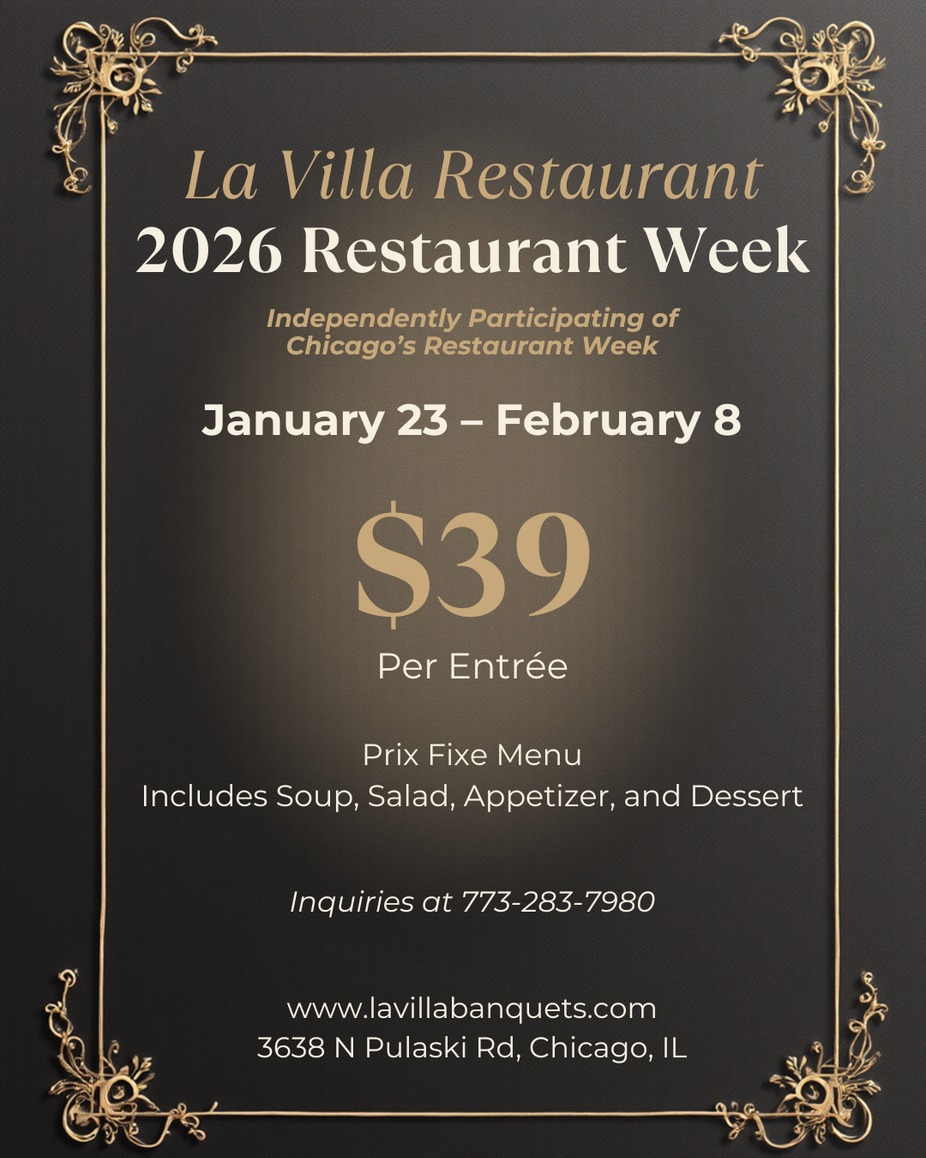 La Villa Restaurant brings to you 2026 Restaurant Week! Independently Participating in Chicago's Restaurant Week. January 23rd thru February 8th. $39 per entree.